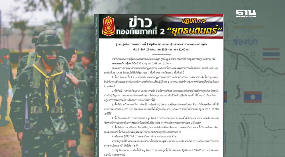 ศูนย์ปฏิบัติการกองทัพภาคที่ 2 สรุปสถานการณ์การสู้รบตามแนวชายแดนไทย-กัมพูชาประจำวันที่ 27 กรกฎาคม 2568 ตามที่เกิดสถานการณ์สู้รบตามแนวชายแดนไทย-กัมพูชา ศูนย์ปฏิบัติการกองทัพภาคที่ 2 สรุปผลการปฏิบัติที่สำคัญ ดังนี้