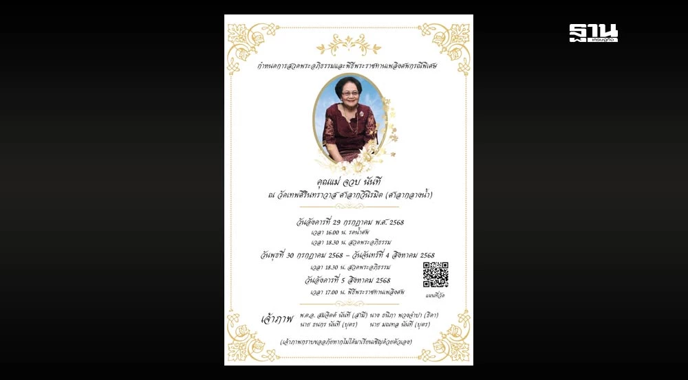 กำหนดการสวดพระอภิธรรม พระราชทานเพลิงศพกรณีพิเศษ คุณแม่ จวบ นันที ณ วัดเทพศิรินทราวาส ศาลากวินิรมิด (ศาลากลายน้ำ)