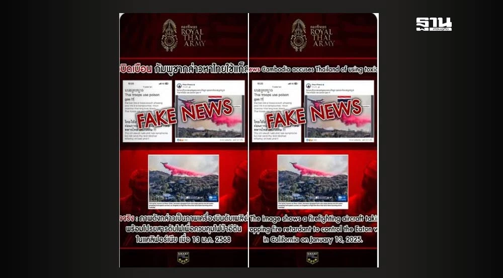 กองทัพภาคที่ 2 ชี้แจงกองทัพไทยไม่ได้ใช้แก๊สพิษแต่ฝ่ายตรงข้ามกลับใช้ “ภาพตัดต่อ” เครื่องบินดับเพลิงปล่อยควันสีแดง เพื่อใส่ร้ายประเทศไทย