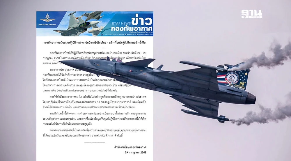 เพจกองทัพอากาศไทย Royal Thai Air Force เปิดเผยสถานการณ์ชายแดนไทย-กัมพูชาล่าสุด (29 ก.ค. 68) โดยระบุว่า กองทัพอากาศไทยได้ปฏิบัติภารกิจสนับสนุนกองทัพบกอย่างต่อเนื่อง ระหว่างวันที่ 24 - 28 กรกฎาคม 2568 ในสถานการณ์ความตึงเครียดบริเวณแนวชายแดนไทย - กัมพูชา เพื่อปกป้องอธิปไตยของชาติ ลดความเสี่ยงต่อพลเรือน และสร้างเงื่อนไขเชิงยุทธศาสตร์ที่เอื้อต่อการเจรจาสันติภาพ
