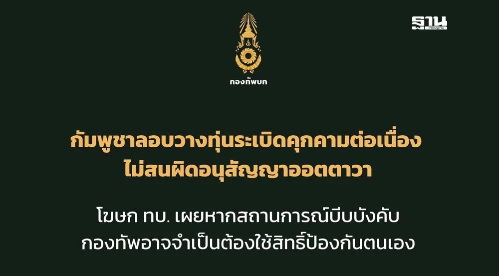 โดยที่ผ่านมากองทัพบกได้ยึดมั่นในแนวทางสันติวิธีมาโดยตลอด และไม่ได้เป็นฝ่ายเริ่มก่อน แต่หากสถานการณ์บีบบังคับก็อาจจำเป็นต้องใช้สิทธิ์ในป้องกันตนเองภายใต้หลักกฎหมายระหว่างประเทศในการคลี่คลายสถานการณ์ที่ทำให้ฝ่ายไทยต้องสูญเสียกำลังพลอย่างต่อเนื่อง จากการละเมิดข้อตกลงหยุดยิงและรุกล้ำอธิปไตยของทหารกัมพูชา