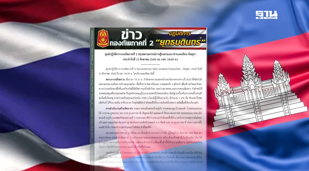 ศูนย์ปฏิบัติการกองทัพภาคที่ 2 แถลงสถานการณ์การตามแนวชายแดนไทย - กัมพูชา ประจำวันที่ 12 สิงหาคม 2568 ถึงเวลา 14.00 น. โดยมีรายละเอียด ดังนี้