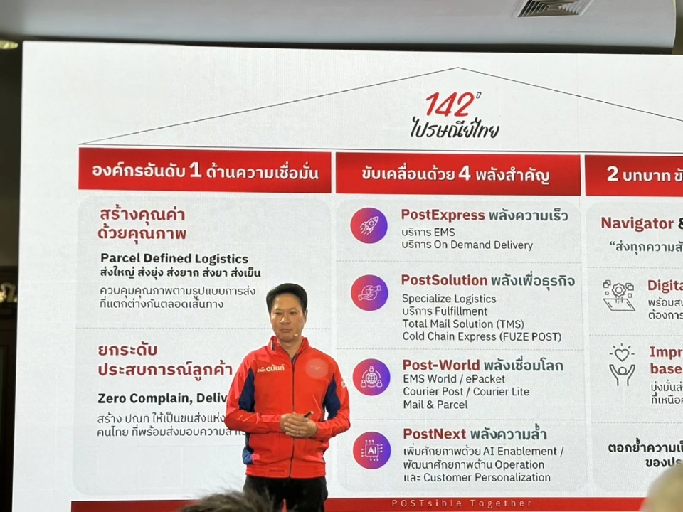 วันที่ 18 สิงหาคม 2568 นายดนันท์ สุภัทรพันธุ์ กรรมการผู้จัดการใหญ่ บริษัท ไปรษณีย์ไทย จำกัด หรือ ปณท. เปิดเผยว่า แผนยุทธศาตร์ไปรษณีย์ไทย ครึ่งปีหลังชูกลยุทธ์ 1-4-2 ซึ่งเป็นวันครบอายุก่อตั้งของ ไปรษณีย์ไทย