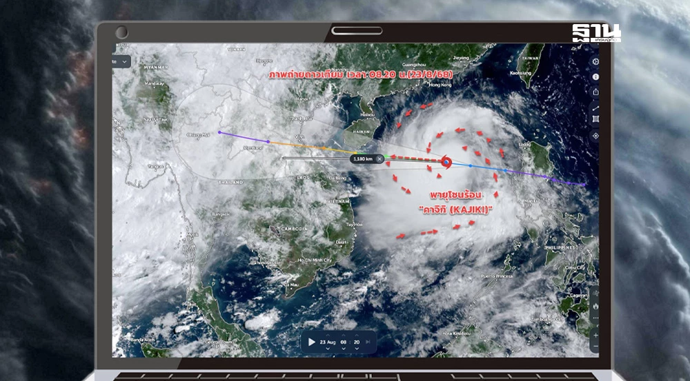 เมื่อเวลา 07.00 น. ของวันนี้ (23 ส.ค. 68) พายุดีเปรสชันบริเวณทะเลจีนใต้ตอนบนได้ทวีกำลังแรงขึ้นเป็นพายุโซนร้อน“คาจิกิ” แล้ว โดยเมื่อเวลา 07.00 น. มีศูนย์กลางอยู่ที่ละติจูด 17.6 องศาเหนือ ลองจิจูด 116.3 องศาตะวันออก ความเร็วลมสูงสุดใกล้ศูนย์กลางประมาณ 65 กิโลเมตรต่อชั่วโมง พายุนี้กำลังเคลื่อนตัวทางทิศตะวันตกด้วยความเร็วประมาณ 30 กิโลเมตรต่อชั่วโมง และมีแนวโน้มจะทวีกำลังแรงขึ้น คาดว่าจะเคลื่อนขึ้นฝั่งบริเวณประเทศเวียดนามและประเทศลาวตอนบน ในช่วงวันที่ 25–26 ส.ค. 68 ประกอบกับมรสุมตะวันตกเฉียงใต้ที่พัดปกคลุมทะเลอันดามัน ประเทศไทย และอ่าวไทยมีกำลังแรงขึ้น