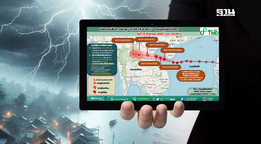 วันที่ 25 สิงหาคม 2568 กรมอุตุนิยมวิทยา อัปเดทสถานการณ์พายุเช้าวันนี้ "พายุไต้ฝุ่นคาจิกิ" บริเวณทะเลจีนใต้ตอนบน (อ่าวเกี๋ย) มีศูนย์กลางห่างจากเมืองวิญ ประเทศเวียดนาม 150 กม. ยังเคลื่อนตัวทางตะวันตกค่อนไปทางเหนือเล็กน้อย จะเคลื่อนขึ้นฝั่งประเทศเวียดนามตอนบนช่วงบ่ายถึงค่ำวันนี้ และ เคลื่อนสู่ สปป.ลาว ต่อไป หลังจากนั้นจะอ่อนกำลังลงตามลำดับพายุอาจจะส่งผลกระทบทางภาคอีสานตอนบนและด้านตะวันออก มีฝนเพิ่มขึ้นและมีฝนตกหนักถึงหนักมากบางแห่ง บริเวณภาคอีสานตอนบน และภาคเหนือ ช่วง 25 - 27 ส.ค.68 ต้องเตรียมการรับมือ (ทิศทางและความแรงของพายุอาจมีการเปลี่ยนแปลง) ติดตามประกาศจากกรมอุตุนิยมวิทยาอย่างใกล้ชิด