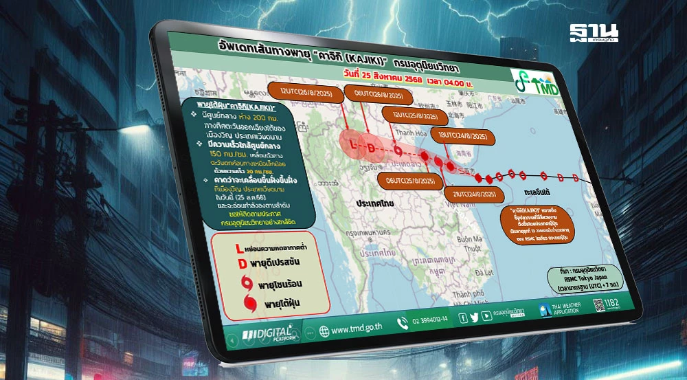 เมื่อเวลา 10.00 น. ของวันนี้ (25 ส.ค. 68) พายุไต้ฝุ่น “คาจิกิ” บริเวณอ่าวตังเกี๋ยมีศูนย์กลางอยู่ห่างประมาณ 120 กิโลเมตร ทางทิศตะวันออกเฉียงใต้ของเมืองวิญ ประเทศเวียดนาม หรือที่ละติจูด 18.4 องศาเหนือ ลองจิจูด 106.8 องศาตะวันออก ความเร็วลมสูงสุดใกล้ศูนย์กลางประมาณ 150 กิโลเมตรต่อชั่วโมง พายุนี้กำลังเคลื่อนตัวทางทิศตะวันตกด้วยความเร็วประมาณ 20 กิโลเมตรต่อชั่วโมง คาดว่าจะเคลื่อนขึ้นฝั่งบริเวณเมืองวิญ ประเทศเวียดนามตอนบนในวันนี้ (25 ส.ค. 68) หลังจากนั้นจะอ่อนกำลังลงเป็นพายุโซนร้อนและพายุดีเปรสชันตามลำดับเคลื่อนเข้าปกคลุมประเทศลาว และภาคตะวันออกเฉียงเหนือตอนบน ของประเทศไทย ในช่วงเช้าวันที่ 26 ส.ค. 68 พายุนี้มีแนวโน้มจะอ่อนกำลังลงเป็นหย่อมความกดอากาศต่ำกำลังแรงก่อนเคลื่อนเข้าปกคลุมภาคเหนือ บริเวณจังหวัดน่านในช่วงเย็นวันที่ 26 ส.ค. 68