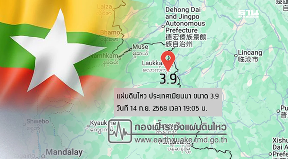 วันที่14 กันยายน 2568 กองเฝ้าระวังแผ่นดินไหว กรมอุตุนิยมวิทยา รายงานว่า เมื่อเวลา 19.05 น.ได้เกิดเหตุแผ่นดินไหวประเทศเมียนมา ขนาด 3.9 ลึก 9 กิโลเมตร ทางทิศตะวันตกเฉียงเหนือของ อำเภอ แม่สาย จังหวัดเชียงราย ประมาณ 370 กิโลเมตร เบื้องต้นไม่มีรายงานการรับรู้แรงสั่นสะเทือน การสั่นไหว