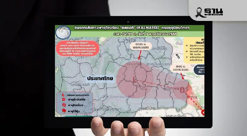 วันที่ 7 พฤศจิกายน 2568 กรมอุตุนิยมวิทยา อัปเดตพายุไต้ฝุ่นคัลแมกี โดยเมื่อเวลา 07.00 น. ของวันนี้พายุ "คัลแมกี" ได้อ่อนกำลังเป็นดีเปรสชันอยู่ที่เมืองจำปาสักตอนล่าง ประเทศลาว คาดจะเข้า อ. สิรินธร จ. อุบลราชธานี ช่วง 09.00-10.00 น. โดยพายุเคลื่อนทางตะวันตกด้วยความเร็ว 30 กิโลเมตรต่อชั่วโมง