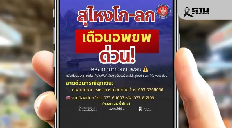 - เทศบาลเมืองสุไหงโก-ลกประกาศเตือนภัยน้ำท่วมฉับพลันและสั่งอพยพประชาชนอย่างเร่งด่วน