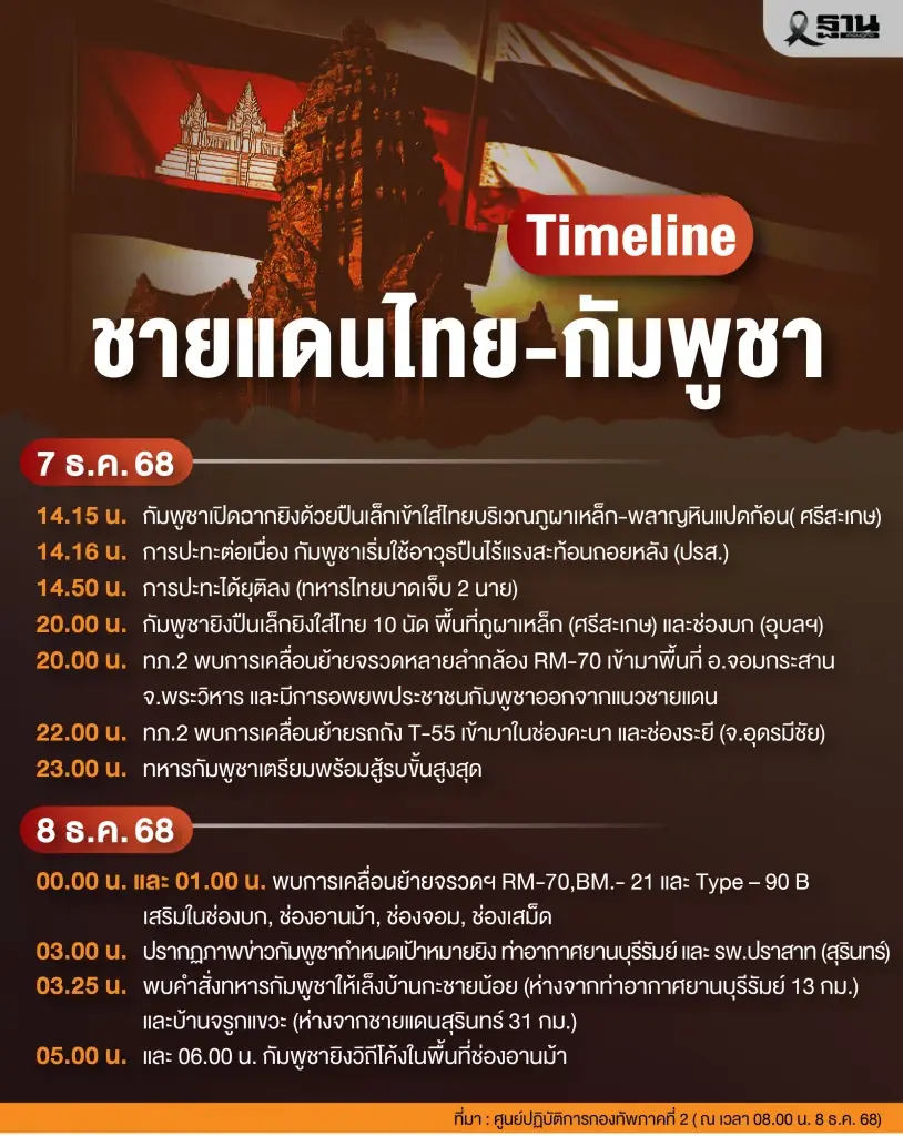 ศูนย์ปฏิบัติการกองทัพภาคที่ 2 แถลงพร้อมกับเปิดเผยเอกสารรายละเอียดสถานการณ์ตามแนวชายแดนไทย-กัมพูชา ประจำวันที่ 8 ธันวาคม 2568 ระบุ ฝ่ายกัมพูชามีการกำหนดเป้าหมายอาวุธยิงสนับสนุนมายังพื้นที่ลึกในจังหวัดสุรินทร์และใกล้ท่าอากาศยานบุรีรัมย์ พร้อมทั้งมีการเคลื่อนย้ายยุทโธปกรณ์และปะทะกับฝ่ายไทยในบางพื้นที่