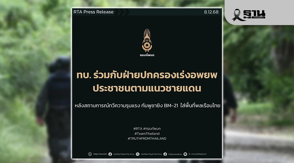 กองทัพบก ได้สั่งการให้กองทัพภาคที่ 1 และกองทัพภาคที่ 2 บูรณาการร่วมกับฝ่ายปกครองและหน่วยงานที่เกี่ยวข้องเร่งดำเนินการอพยพประชาชนออกจากพื้นที่เสี่ยงภัยไปยังศูนย์พักพิงชั่วคราว ตามแผนอพยพ ตั้งแต่วันที่ 7 ธันวาคม 2568 เป็นต้นมา เพื่อให้ประชาชนอยู่ในเขตปลอดภัยสูงสุดและลดความสูญเสียต่อชีวิตและทรัพย์สิน อันเป็นความเสียหายที่ประชาชนไม่ควรต้องเผชิญจากการปฏิบัติที่ไม่เป็นธรรมของฝ่ายกัมพูชา
