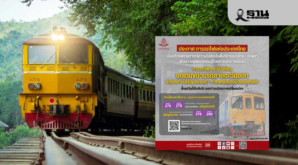 การรถไฟแห่งประเทศไทย (รฟท.) ประกาศงดเดินขบวนรถธรรมดาหมายเลข 275/276 และ 279/280 เฉพาะช่วงสถานีอรัญประเทศ-ด่านพรมแดนบ้านคลองลึกเป็นการชั่วคราว ตั้งแต่วันนี้เป็นต้นไป โดยให้เหตุผลว่าต้องคำนึงถึงความปลอดภัยของผู้โดยสารและเจ้าหน้าที่