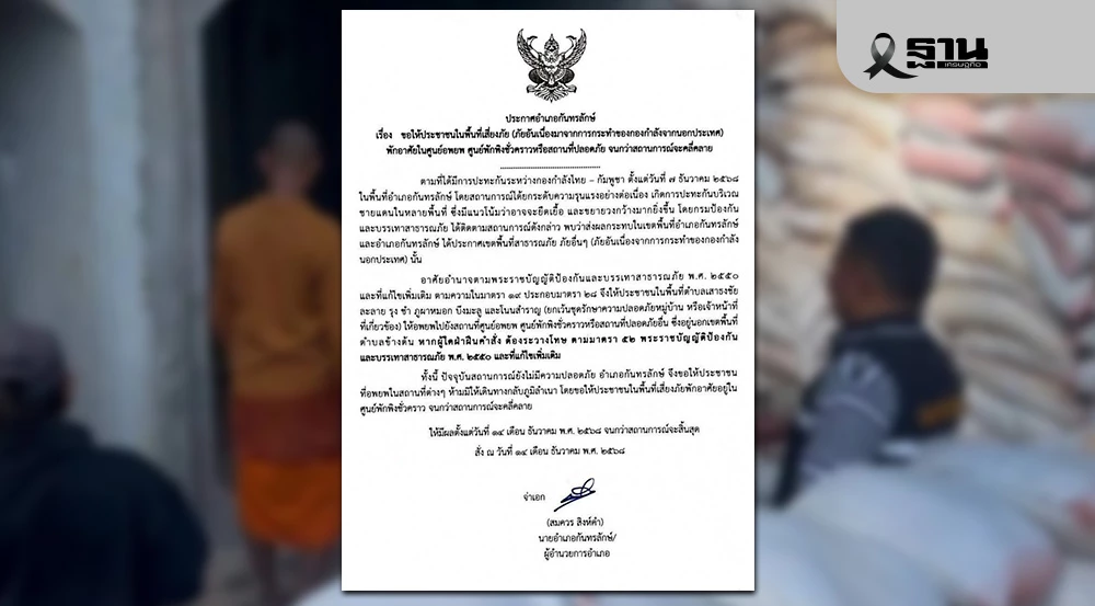 วันนี้ 14 ธันวาคม 2568 จ่าเอก สมควร สิงห์คำ นายอำเภอกันทรลักษ์/ ผู้อำนวยการอำเภอ ได้ลงนามออก ประกาศอำเภอกันทรลักษ์ เรื่อง ขอให้ประชาชนในพื้นที่เสี่ยงภัย (ภัยอันเนื่องมาจากการกระทำของกองกำลังจากนอกประเทศ) พักอาศัยในศูนย์อพยพ ศูนย์พักพิงชั่วคราวหรือสถานที่ปลอดภัย จนกว่าสถานการณ์จะคลี่คลาย