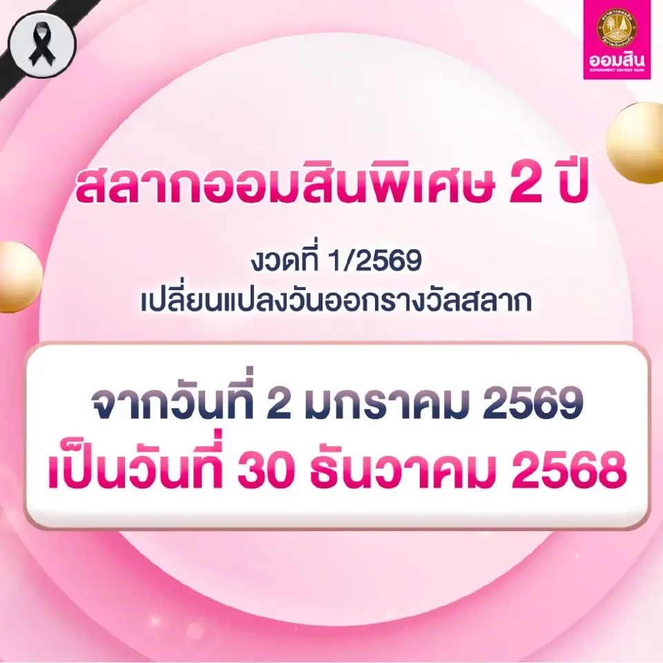 ธนาคารออมสินแจ้งเปลี่ยนแปลงการออกรางวัลสลากออมสินพิเศษ 2 ปี งวดเดือนมกราคม 2569 จากเดิมจะทำการออกรางวัลในวันที่ 2 มกราคม 2569 ก็ปรับมาเป็นวันที่ 30 ธันวาคม 2568 โดยในวันนี้จะเป็นการออกรางวัลสลากออมสินพิเศษ 2 ปี และ สลากออมสินพิเศษดิจิทัล 2 ปี ใครที่เป็นเจ้าของสลากออมสินแบบ 2 ปี สามารถลุ้นเลขเด็ด เลขดัง เลขที่ออก รางวัลที่ 1 ผ่านการถ่ายทอดสดทางเฟซบุ๊กไลฟ์ 9 MCOT โดยจะเริ่มถ่ายทอดสดตั้งแต่ 10.30 น. ทั้งนี้สามารถตรวจสอบลิงก์ถ่ายทอดสด พร้อมทั้งช่องทางตรวจหวยออมสิน ตรวจหวยงวดนี้ ได้ดังต่อไปนี้