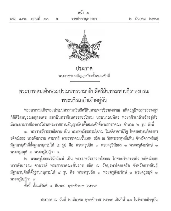 วันที่ 2 มีนาคม 2569 เว็บไซต์ ราชกิจจานุเบกษา เผยแพร่ประกาศ พระบรมราชโองการโปรดพระราชทานสัญญาบัตรตั้งสมณศักดิ์พระราชาคณะ จำนวน 2 รูป โดยระบุว่า