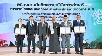 โดยวันนี้ได้มีพิธีลงนามบันทึกความเข้าใจ ระหว่างกรมการแพทย์แผนไทยและการแพทย์ทางเลือก, มหาวิทยาลัยสงขลานครินทร์ และสำนักงานคณะกรรมการอิสลามประจำจังหวัดสมุทรปราการ เพื่อร่วมกันส่งเสริมธุรกิจการนวดไทยและผลิตภัณฑ์สมุนไพรเข้าสู่ตลาดซาอุดิอาระเบีย