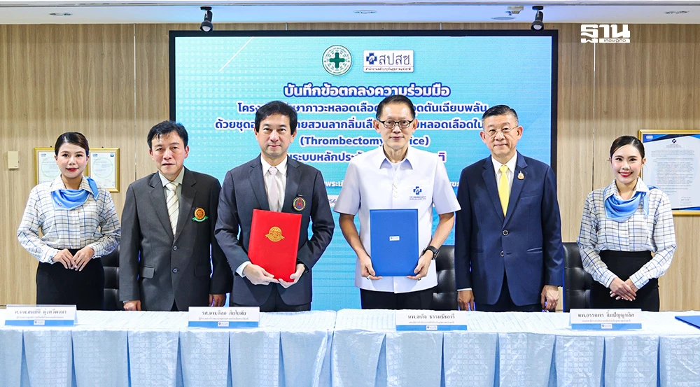 1 สิงหาคม 2568 โรงพยาบาลธรรมศาสตร์เฉลิมพระเกียรติ และ สำนักงานหลักประกันสุขภาพแห่งชาติ (สปสช.) ได้ร่วมลงนามบันทึกข้อตกลงความร่วมมือ เรื่อง โครงการรักษาภาวะหลอดเลือดสมองอุดตันเฉียบพลัน ด้วยชุดอุปกรณ์สายสวนลากลิ่มเลือดสำหรับหลอดเลือดในสมอง (Thrombectomy Device) ในระบบหลักประกันสุขภาพแห่งชาติ โดยมี รศ.นพ.ดิลก ภิยโยทัย ผู้อำนวยการโรงพยาบาลธรรมศาสตร์เฉลิมพระเกียรติ และและ นพ.จเด็จ ธรรมธัชอารี เลขาธิการสำนักงานหลักประกันสุขภาพแห่งชาติ เป็นผู้ลงนามฯ มี ศ.นพ.สมบัติ มุ่งทวีพงษา รองคณบดีฝ่ายบริการสุขภาพและวิชาการ คณะแพทยศาสตร์ มหาวิทยาลัยธรรมศาสตร์ และ ทพ.อรรถพร ลิ้มปัญญาเลิศ รองเลขาธิการ สปสช. ร่วมลงนามเป็นพยาน