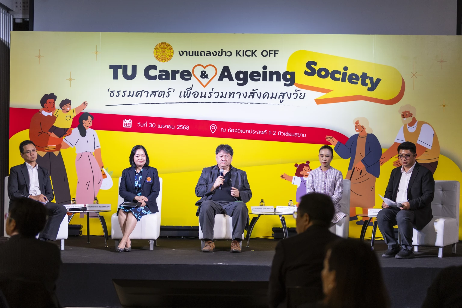 มหาวิทยาลัยธรรมศาสตร์ (มธ.) จัดงานแถลงข่าว KICK OFF โครงการ TU Care & Ageing Society ‘ธรรมศาสตร์’ เพื่อนร่วมทางสังคมสูงวัย เมื่อวันที่ 30 เม.ย. 2568 ประกาศความพร้อมที่จะเป็นส่วนหนึ่งในการดูแลประชาชนและรับใช้สังคมท่ามกลางสถานการณ์ความท้าทายสังคมสูงวัย โดยภายในงานมีการจัดเวทีเสวนา Talk & Share: TU Care & Ageing Society ซึ่งมี 4 นักวิชาการธรรมศาสตร์ร่วมให้มุมมองถึงสถานการณ์ และแนวทางที่มหาวิทยาลัยธรรมศาสตร์ จะเป็นส่วนหนึ่งในการรับมือกับสังคมผู้สูงวัยในประเทศไทย