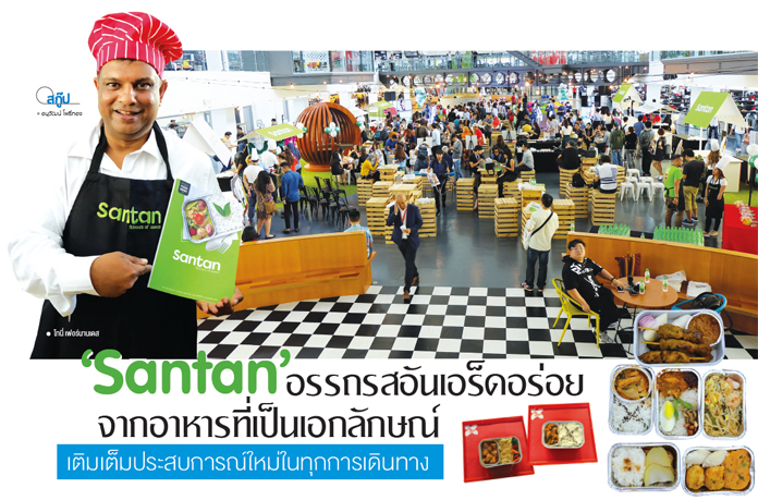 สำหรับบรรยากาศการจัดงาน Santan Food Festival มีการนำเสนอเมนูอาหารอันเลิศรสจากชนชาติต่างๆ อย่างหลากหลาย ยกตัวอย่างเช่นแกงเขียวหวานไก่ ผัดไทยและข้าวเหนียวมะม่วงจากประเทศไทย ทั้งนี้ยังมี Nasi Lemak, Roti Jala และ Nasi Kuning Manado ประเทศมาเลเซีย Chicken Adobo จากประเทศฟิลิปปินส์ South India Delight จากประเทศอินเดีย Miso Chicken with Garlic Rice ประเทศญี่ปุ่น Stir-fry Kimchi Chicken ประเทศเกาหลี รวมทั้งออร์เดิร์ฟขนมหวานและของขบเคี้ยวอื่นๆ อย่างเช่น Coconut Pudding , Satay, Curry Puff, Mac & Cheese, Sweet & Sour Meatballs โดยอาหารดังกล่าวเป็นส่วนหนึ่งของ Santan ที่พร้อมให้บริการบนเครื่องบินในช่วงเวลาดังกล่าวนี้ ซึ่งอาหารอีกหลากหลายเมนูอันโดดเด่นของแต่ละชนชาติจะถูกนำมาหมุนเวียนและสลับสับเปลี่ยนในทุกๆ 3 เดือน เพื่อสร้างความสดใหม่ ประทับใจ และอรรถรสอันนุ่มลึกในทุกการเดินทาง สำหรับยอดการจองและสั่งซื้ออาหารบนเครื่องบินจาก Santan ในช่วงไตรมาส 1-2 ที่ผ่านมาอยู่ที่ร้อยละ 30 จากผู้โดยสารทัง้ หมดโดยคุณโทนี่ตั้งเป้าหมายไว้ที่ร้อยละ 60 จากผู้โดยสารทั้งหมดในระยะเวลา 2 ปี