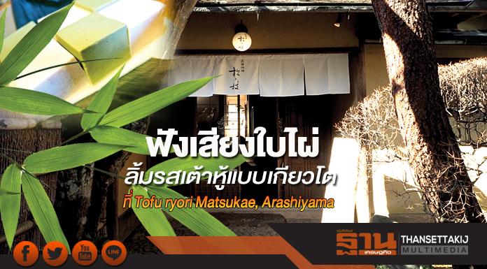 รั้วสีนํ้าตาลจากกิ่งไผ่จนอัดแน่น ชักนำเท้าทั้งสองข้างของเราเข้าไปสู่ร้าน “Matsukae” ร้านที่นำทางเราด้วยภาพเต้าหู้สองสี สีขาวนวลแบบดั้งเดิม และสีเขียวอ่อนจากชาเขียว เรียงสลับดุจภาพศิลปะบนใบไผ่สีเขียวสด การจัดเซตเมนูอาหารราคาเริ่มต้นตั้งแต่ 2,000 เยน ราคาเพิ่มลดตามองค์ประกอบของเมนู เต้าหู้ที่ผ่านการคัดสรรจากถั่วเหลืองที่ปลูกแบบปลอดสารพิษในประเทศ ผ่านกระบวนการแสนละเอียดลออตัดเป็นสี่เหลี่ยมลูกเต๋าขนาดเท่าๆ กัน เสิร์ฟทั้งแบบร้อนและแบบเย็น หากเสิร์ฟแบบเย็นเต้าหู้จะถูกจัดเรียงบนใบไผ่และมีนํ้าเต้าหู้เย็นแบบขลุกขลิกมาในถาดไม้ทรงกลม หากเสิร์ฟแบบร้อนจะมาในถาดโลหะ วางตั้งบน