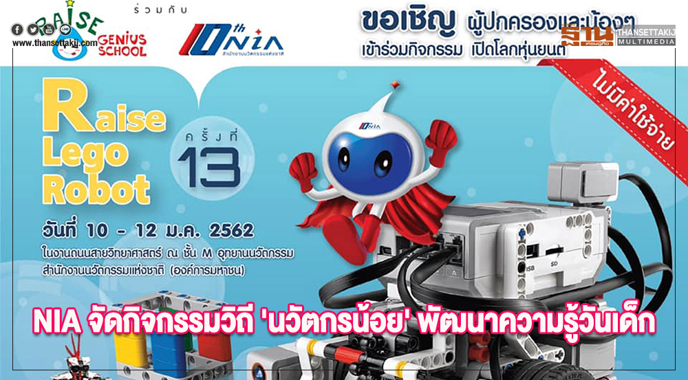 "เปิดโลกหุ่นยนต์ Raise Lego Robot ครั้งที่ 13" โดยจะได้พบกับนิทรรศการการจำลองเครื่องจักรผลิตสบู่เหลว เวิร์กช็อปประดิษฐ์เครื่องเป่าฟองสบู่ (รอบบุคคลทั่วไป ไม่จำเป็นต้องมีประสบการณ์ รับน้องอายุ 7 ขวบขึ้นไป) การแข่งขันและประกวดหุ่นยนต์ (น้องนักเรียน Raise Genius 6 ขวบขึ้นไป) ซึ่งหากใครสนใจกิจกรรมดี ๆ มีประโยชน์แบบนี้ ก็มาพบกันได้ที่ NIA : สำนักงานนวัตกรรมแห่งชาติ ในวันที่ 10-12 ม.ค. 2562 สามารถเข้าร่วมกิจกรรมได้ฟรีไม่มีค่าใช้จ่าย