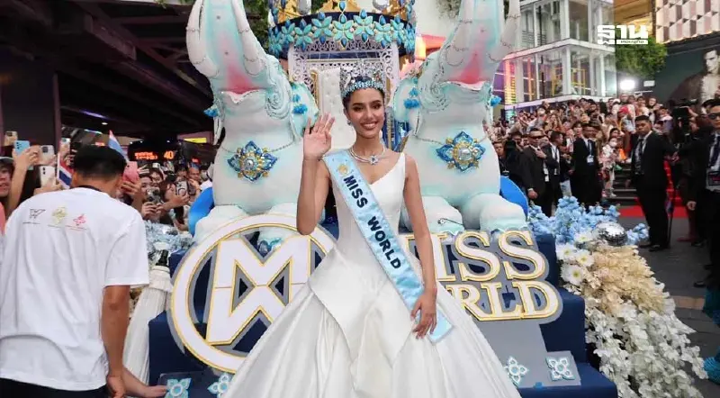 แสนโกศิก ต่อด้วยรถคณะนางงาม จาก TPN GLOBAL อาทิ นางสาวไทย, คณะมิสเตอร์โกลบอล และคณะนางงามรุ่นพี่ อาทิ น้ำตาล-ชลิตา ส่วนเสน่ห์, แนท-อนิพรณ์ เฉลิมบูรณะวงศ์ พร้อมด้วยคณะผู้สนับสนุนการจัดงาน ที่มาร่วมบันทึกประวัติศาสตร์การแห่ฉลองต้อนรับมิสเวิลด์คนแรกของประเทศไทยในรอบ 72 ปี ท่ามกลางความสนใจของประชาชนที่มาร่วมต้อนรับ พร้อมยลโฉมความงามของมิสเวิลด์ 2025 และ “มงฟ้า” อันทรงคุณค่า ตลอดเส้นทาง