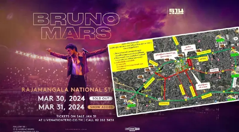 คอนเสิร์ต BRUNO MARS LIVE IN BANGKOK เริ่มวันนี้ 30 -31 มีนาคม 67 ตำรวจแนะวิธีการเดินทางมายังราชมังคลากีฬาสถาน ตรวจสอบเส้นทางที่นี่