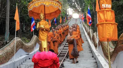 - เวลา 06.45 น. พระภิกษุ-สามเณร และพุทธศาสนิกชน พร้อมกัน ณ บริเวณทางขึ้นภูเขาทอง