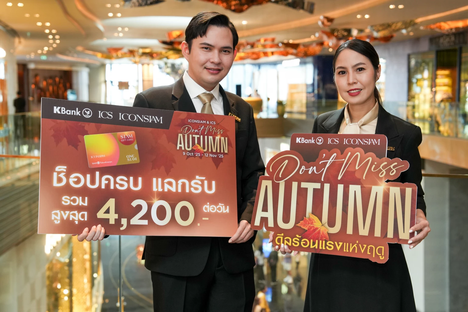 ไอคอนสยาม และไอซีเอส ตอกย้ำความเป็นจุดหมายปลายทางของนักท่องเที่ยวทั่วโลก ต้อนรับโค้งสุดท้ายปลายปีด้วยโปรโมชันในแคมเปญ “Don’t Miss Autumn!” เอาใจสายช้อปด้วยดีลร้อนแรงที่สุดแห่งฤดูกาล มอบสิทธิพิเศษให้สมาชิก ONESIAM ที่ใช้จ่ายผ่านบัตรเครดิตกสิกรไทย ครบตามยอดที่กำหนด รับทันทีของรางวัลสุดเอ็กซ์คลูซีฟ พร้อม Siam Gift Card มูลค่าสูงสุด 3,000 บาท รวมกว่า 3,600 รางวัล ตั้งแต่ 9 ตุลาคม – 12 พฤศจิกายนนี้เท่านั้น