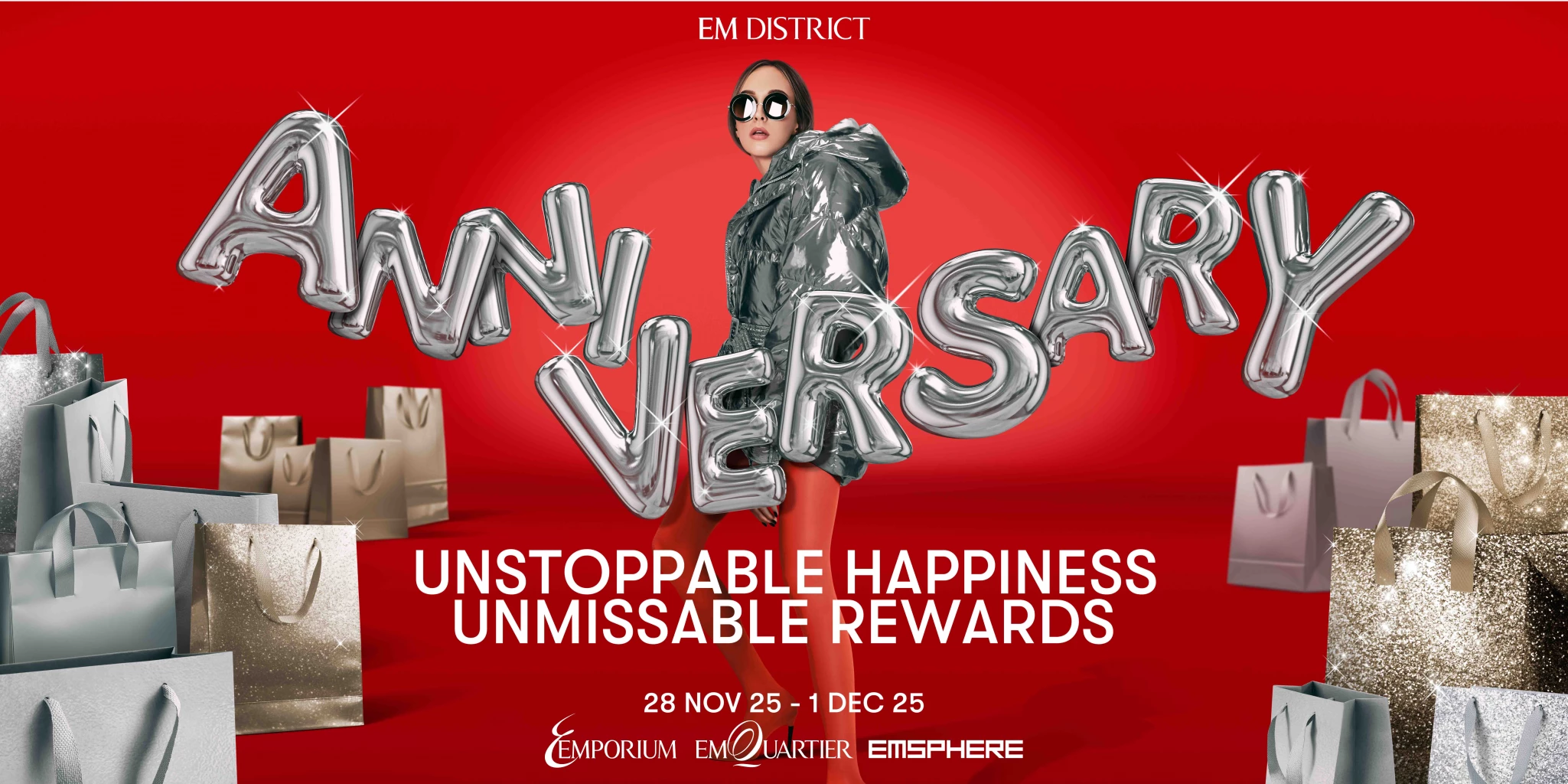 EM DISTRICT ANNIVERSARY UNSTOPPABLE HAPPINESS UNMISSABLE REWARDS และ EM DISTRICT WINTER WONDERLAND สร้างปรากฏการณ์เฉลิมฉลองสุดยิ่งใหญ่ด้วยเอ็กซ์คลูซีฟโปรโมชั่น และอีเวนท์ยิ่งใหญ่สุดตระการตา สร้างความสุขให้ทุกคนต่อเนื่องตั้งแต่วันแรกที่เริ่มแคมเปญจนถึงสิ้นปี 2568 เริ่มจากแคมเปญโปรโมชั่นพิเศษ EM DISTRICT ANNIVERSARY ระหว่างวันที่ 28 – 1 ธันวาคม 2568 แคมเปญยิ่งใหญ่ สุดเอ็กซ์คลูซีฟที่มีมูลค่ารางวัลมากที่สุดแห่งปี และจับมือรวมกับพันธมิตรมากที่สุดกว่า 30 พันธมิตรธุรกิจ ครอบคลุมทุกภาคส่วนธุรกิจ