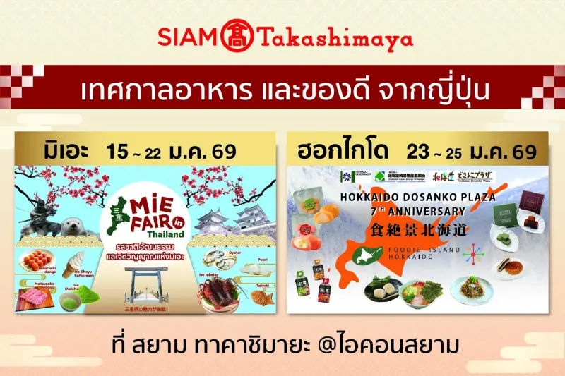 สายเจแปนห้ามพลาด! สยาม ทาคาชิมายะ จัดใหญ่ต้นปี ยกตำนานความอร่อยจาก “มิเอะ–ฮอกไกโด” รวมเมนูพรีเมียม หาทานยาก นินจาโชว์สุดตื่นตา เสิร์ฟครบทั้งรสชาติและวัฒนธรรมญี่ปุ่น ตลอดมกราคมนี้ที่ไอคอนสยาม
