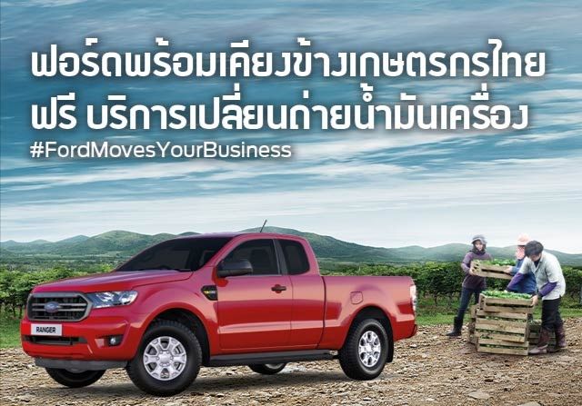 "ฟอร์ด ประเทศไทย ส่งแคมเปญ ‘ฟอร์ดพร้อมเคียงข้างคุณ’ #FordMovesYourBusiness มอบสิทธิ์รับบริการเปลี่ยนถ่ายน้ำมันเครื่อง ฟรี ให้กับเกษตรกรไทยผู้ใช้รถกระบะทุกท่าน ที่โชว์รูมฟอร์ดทั่วประเทศ โดยเกษตรกรเจ้าของรถกระบะทุกยี่ห้อ สามารถนัดหมายเข้ารับบริการเปลี่ยนถ่ายน้ำมันเครื่องกับผู้จำหน่ายฟอร์ดล่วงหน้าผ่านแผนกลูกค้าสัมพันธ์ของศูนย์บริการ เพื่อเข้ารับบริการเปลี่ยนถ่ายน้ำมันเครื่องได้ตั้งแต่วันที่ 1 ตุลาคม 2563 ถึง 25 ธันวาคม 2563 หรือดูรายละเอียดแคมเปญได้ที่ https://www.ford.co.th/ford-movesyourbusiness/