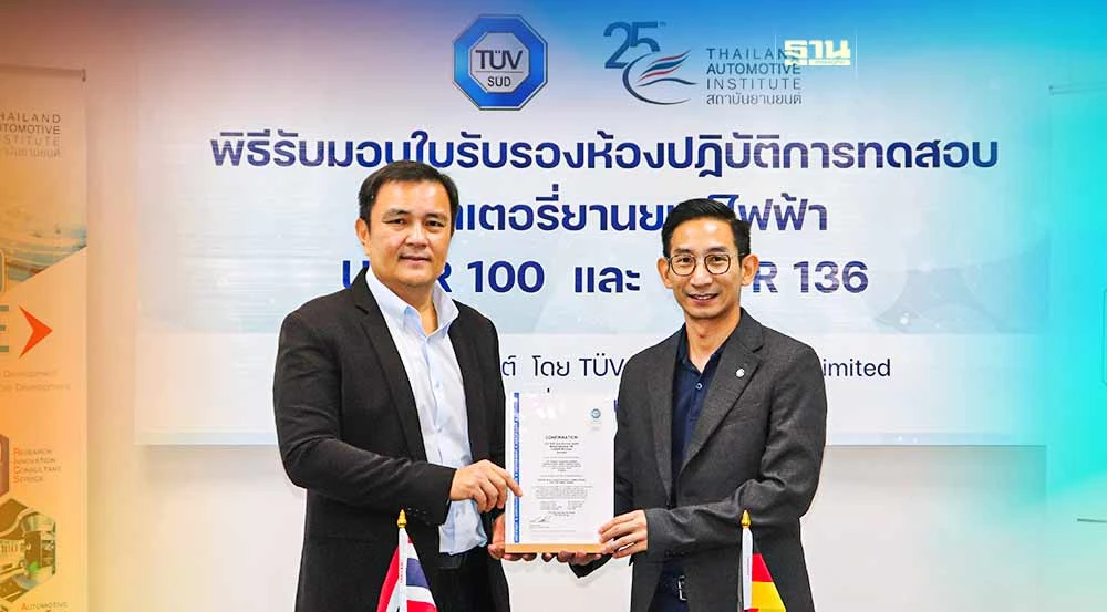 ทั้งนี้มี ดร.เกรียงศักดิ์ วงศ์พร้อมรัตน์ ผู้อำนวยการสถาบันยานยนต์ รับมอบใบรับรองห้องปฏิบัติการทดสอบแบตเตอรี่ยานยนต์ไฟฟ้า จาก นายกุลธัช บุญบงการ ผู้จัดการทั่วไป บริษัท ทูฟ ซูด (ประเทศไทย) จำกัด โดยห้องปฏิบัติการดังกล่าวสามารถให้บริการการทดสอบแบตเตอรี่ตามมาตรฐานรถยนต์ไฟฟ้า UN-R 100 และมาตรฐานรถจักรยานยนต์ไฟฟ้า UN-R 136 ครบทั้ง 9 รายการ ดังนี้