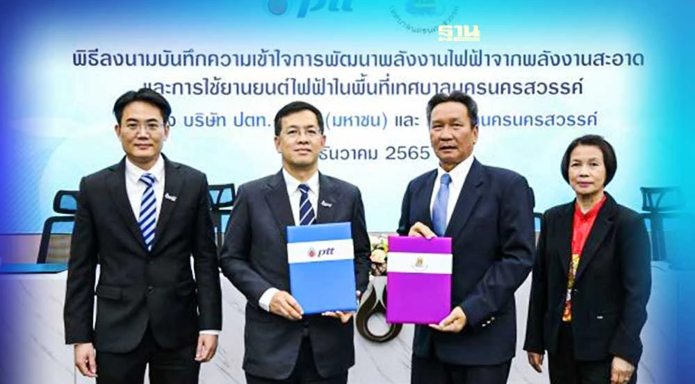 วันนี้ (19 ธันวาคม 2565) – นายเชิดชัย บุญชูช่วย รองกรรมการผู้จัดการใหญ่นวัตกรรมและธุรกิจใหม่ บริษัท ปตท. จำกัด (มหาชน) (ที่ 2 จากซ้าย) พร้อมด้วย นายชาญ กุลภัทรนิรันดร์ ผู้ช่วยกรรมการผู้จัดการใหญ่พัฒนาธุรกิจใหม่ บริษัท ปตท. จำกัด (มหาชน) (ซ้าย) นายจิตตเกษมณ์ นิโรจน์ธนรัฐ นายกเทศมนตรีนครนครสวรรค์ (ที่ 2 จากขวา) และ นางสุณี มังคลารัตนศรี ปลัดเทศบาลนครนครสวรรค์ (ขวา) ร่วมลงนามบันทึกความเข้าใจการพัฒนาพลังงานไฟฟ้าจากพลังงานสะอาด และการใช้ยานยนต์ไฟฟ้าในพื้นที่เทศบาลนครนครสวรรค์ ระหว่าง บริษัท ปตท. จำกัด (มหาชน) และ เทศบาลนครนครสวรรค์