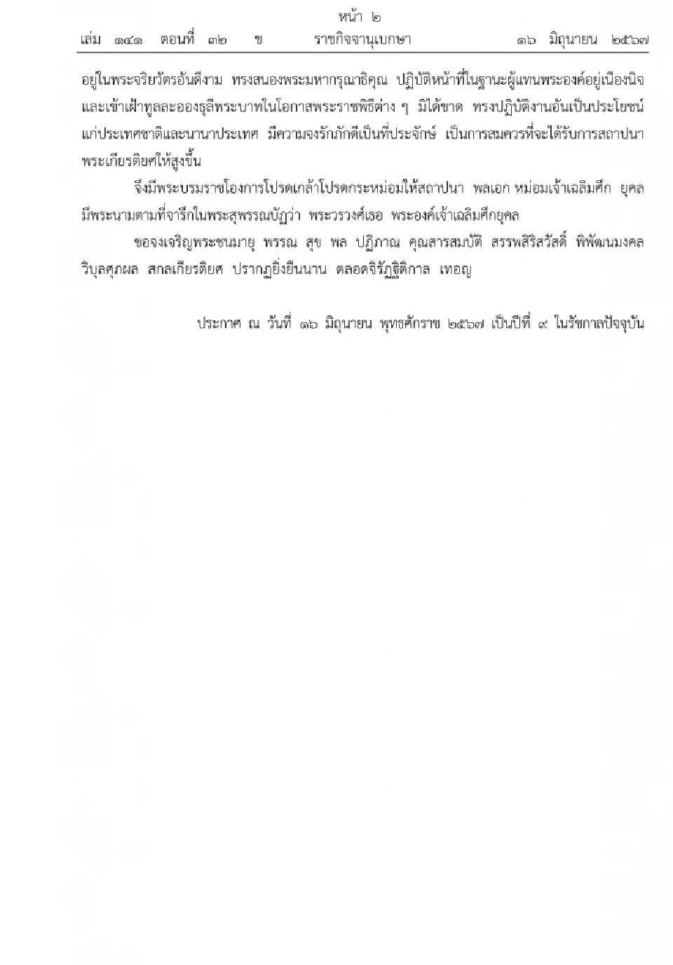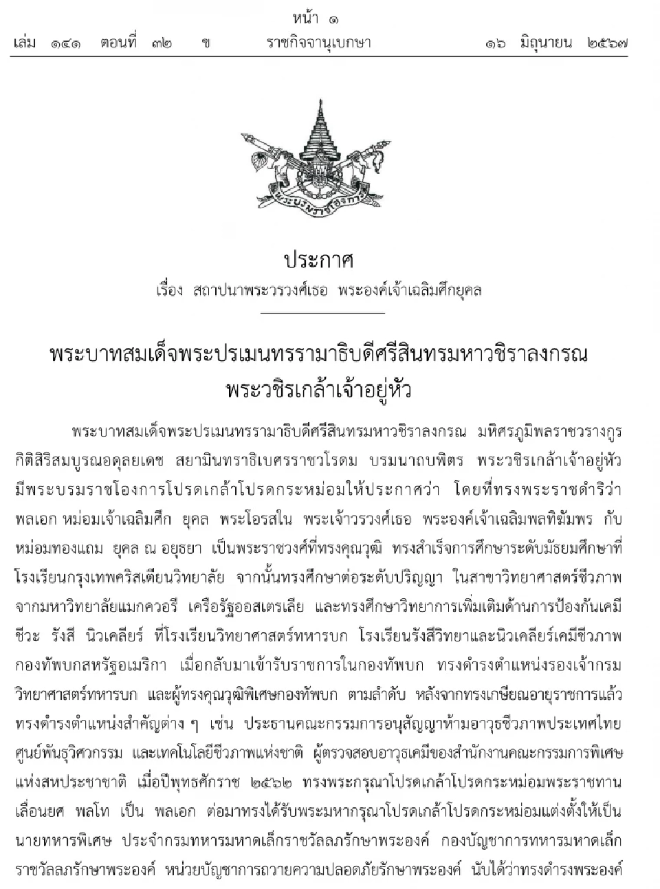 16 มิถุนายน 2567 ราชกิจจานุเบกษา เผยแพร่ พระบรมราชโองการ ประกาศ เรื่อง สถาปนาพระวรวงศ์เธอ พระองค์เจ้าเฉลิมศึกยุคล ความว่า พระบาทสมเด็จพระปรเมนทรรามาธิบดีศรีสินทรมหาวชิราลงกรณ มหิศรภูมิพลราชวรางกูร กิติสิริสมบูรณอดุลยเดช สยามินทราธิเบศรราชวโรดม บรมนาถบพิตร พระวชิรเกล้าเจ้าอยู่หัว มีพระบรมราชโองการโปรดเกล้าโปรดกระหม่อมให้ประกาศว่า