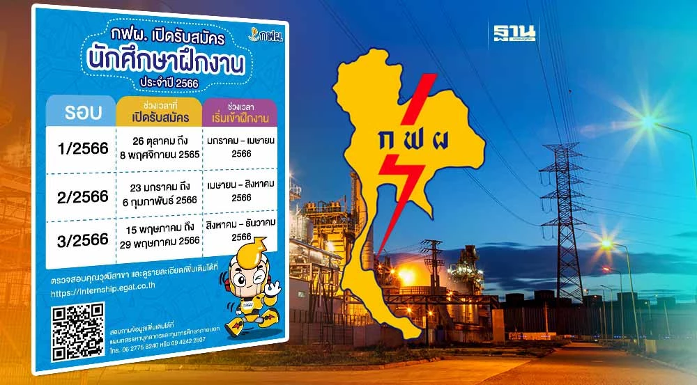 การไฟฟ้าฝ่ายผลิตแห่งประเทศไทย หรือ กฟผ.ประกาศเปิดรับสมัครนักศึกษาฝึกงาน ประจำปี 2566 โดยในครั้งนี้ถือเป็นรอบ 2 ที่ได้เปิด สำหรับนักศึกษาที่สนใจสามารถสมัครเข้ามาได้ตั้งแต่วันที่ 23 มกราคม – 6 กุมภาพันธ์ 2566 และจะเริ่มเข้าฝึกงานในเดือน เมษายน – สิงหาคม 2566 ส่วนใครที่ไม่ทันรอบนี้ ก็จะมีรอบที่ 3 โดยจะเปิดรับสมัครวันที่ 15 พฤษภาคม – 29 พฤษภาคม 2566 และเข้าฝึกงานในเดือน สิงหาคม – ธันวาคม 2566