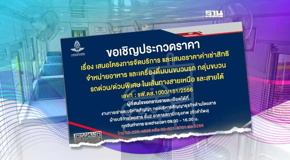 การรถไฟแห่งประเทศไทย จึงได้ออกประกาศเชิญชวนภาคเอกชนที่สนใจเสนอโครงการจัดบริการและเสนอราคาค่าเช่าสิทธิจำหน่ายอาหารและเครื่องดื่มบนขบวนรถ กลุ่มขบวนรถด่วน/ด่วนพิเศษ ในเส้นทางสายเหนือและสายใต้ ระยะเวลา 3 ปี จำนวน 10 ขบวน ประกอบด้วย