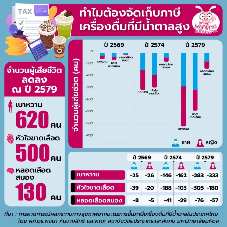 “ผลการศึกษา คาดประมาณจำนวนผู้ป่วยและผู้เสียชีวิตที่ป้องกันได้ แยกแต่ละโรค เมื่อเทียบกับการมีการเก็บภาษี และไม่มีการเก็บภาษีเครื่องดื่มที่มีน้ำตาล ณ ปี 2579 สามารถป้องกันการเกิดโรคเบาหวานได้ 21,000 คน โรคหัวใจขาดเลือด 2,000 คน โรคหลอดเลือดสมอง 1,100 คน ขณะที่จำนวนผู้เสียชีวิตลดลง โรคเบาหวาน 620 คน โรคหัวใจขาดเลือด 500 คนโรคหลอดเลือดสมอง 130 คน”