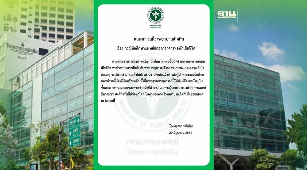 วันที่ 29 มิถุนายน โรงพยาบาลเลิดสิน เผยแพร่แถลงการณ์เรื่อง กรณีนักศึกษาแพทย์ตกจากอาคารหอพักเสียชีวิต ตามที่มีข่าวทางช่องต่าง ๆ เรื่อง นักศึกษาแพทย์ชั้นปีที่ 6 ตกจากอาคารหอพักเสียชีวิต ทางโรงพยาบาลเลิดสินรับทราบเหตุการณ์ดังกล่าวและขอแสดงความเสียใจต่อเหตุการณ์ดังกล่าว
