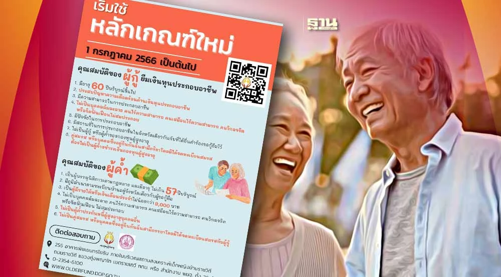 กระทรวงการพัฒนาสังคมและความมั่นคงของมนุษย์ (พม.) อัปเดทหลักเกณฑ์การกู้ยืมเงินทุนประกอบอาชีพของกองทุนผู้สูงอายุ ที่เปิดโอกาสให้ผู้สูงอายุ 60 ปีขึ้นไป กู้ยืมเงินทุนประกอบอาชีพ รายละไม่เกิน 30,000 บาท รายกลุ่มวงเงินไม่เกิน 100,000 บาท (ผู้ร่วมกู้ไม่น้อยกว่า 5 คน) ชำระคืนเป็นรายงวด ภายใน 3 ปี โดยไม่มีดอกเบี้ย ทั้งนี้เพื่อเป็นเงินทุนหรือเป็นเงินทุนหมุนเวียนในการประกอบธุรกิจ รวมถึงหมุนเวียนสภาพคล่อง ทดแทนการเป็นหนี้นอกระบบ เริ่มใช้ 1 ก.ค. 66 เป็นต้นไป