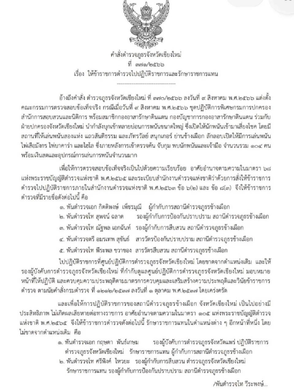 และได้แต่งตั้งรองผู้บังคับการตำรวจภูธรจังหวัดเชียงใหม่เข้ามารักษาราชการแทน