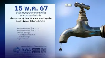 แจ้ง ประกาศ น้ำประปาไม่ไหล ผู้สื่อข่าวรายงานว่า การประปานครหลวงสาขาลาดพร้าว ได้ประชาสัมพันธ์ น้ำประปาไม่ไหล เนื่องจากตัดบรรจบท่อประปา ในคืนวันพุธที่ 15 พฤษภาคม 2567 เวลา 22.00 - 05.00 น. ของวันรุ่งขึ้น ส่งผลให้ น้ำประปาไม่ไหล ในพื้นที่ดังนี้