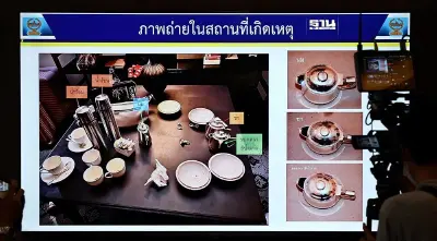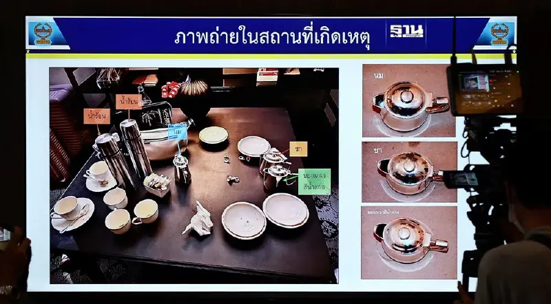 ผลการตรวจสอบสารเบื้องต้นพบว่าในแก้วน้ำชาทั้ง 6 ใบมีสารไซยาไนด์ เชื่อว่า 1 ใน 6 ของผู้เสียชีวิตเป็นผู้ลงมือก่อเหตุ โดยใช้สารดังกล่าว ซึ่งกำลังตรวจสอบว่ามีการนำเข้าหรือซื้อในประเทศไทย.