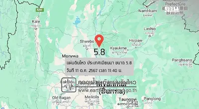 วันนี้ (11 ตุลาคม 2567) กองเฝ้าระวังแผ่นดินไหว กรมอุตุนิยมวิทยา ได้รายงานการเกิดแผ่นดินไหวขนาด 5.8 ตามมาตราริกเตอร์ ที่ Nat Taung ประเทศเมียนมา เมื่อเวลา 11.40 น. ตามเวลาประเทศไทย