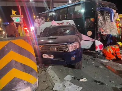อุบัติเหตุวันนี้ ล่าสุด รถบัสที่มีชาวรัสเซียทั้งคัน ชนฟอร์จูนเนอร์ที่ด่านมอเตอร์เวย์ เส้นเข้าพัทยา นักท่องเที่ยวเจ็บ 27 ราย เจ้าหน้าที่เร่งช่วยเหลือและเคลียร์พื้นที่
