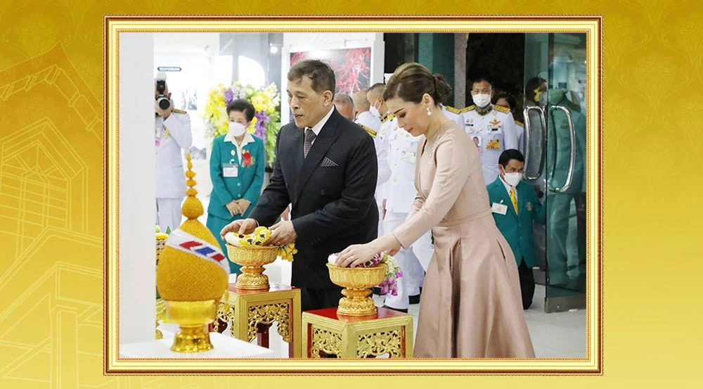 จากนั้น เสด็จพระราชดำเนินไปทรงกราบที่หน้าเครื่องนมัสการ ทรงลาพระสงฆ์ แล้วเสด็จพระราชดำเนินไปยังโถงชั้น 1 อาคารมหิตลาธิเบศร ทรงวางพวงมาลัยถวายราชสักการะพระฉายาลักษณ์สมเด็จพระมหิตลาธิเบศร อดุลยเดชวิกรม พระบรมราชชนก ทรงคม และทอดพระเนตรนิทรรศการ เฉลิมพระเกียรติสมเด็จพระมหิตลาธิเบศร อดุลยเดชวิกรม พระบรมราชชนก ซึ่งทรงปฏิบัติพระราชกรณียกิจนานัปการต่อวงการแพทย์ สาธารณสุข และการอุดมศึกษาของประเทศไทย จึงทำให้ทรงได้รับการถวายพระสมัญญานาม พระบิดาแห่งการแพทย์แผนปัจจุบัน พระบิดาแห่งการสาธารณสุขไทย และพระบิดาแห่งการอุดมศึกษาไทย