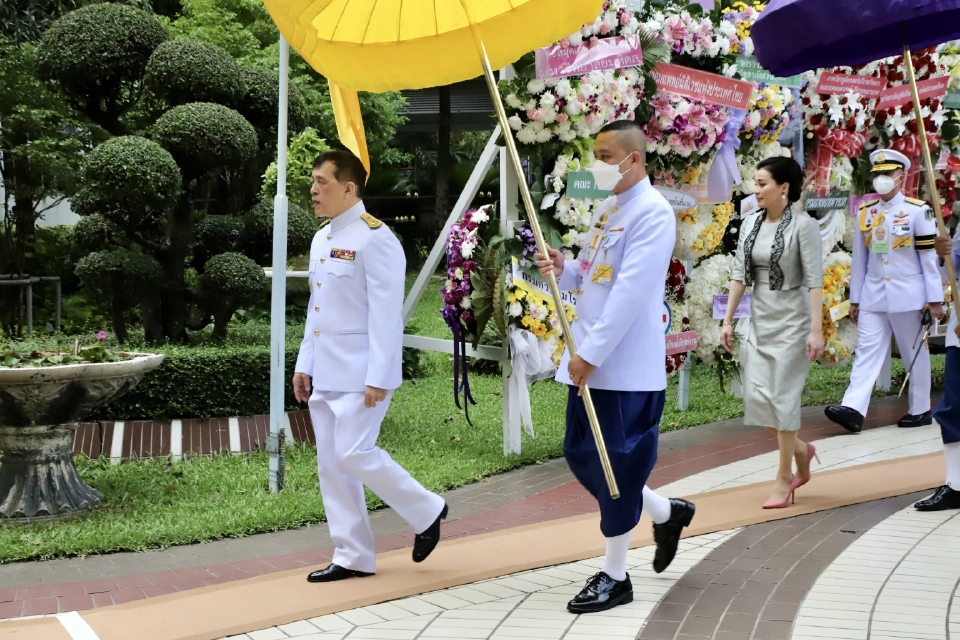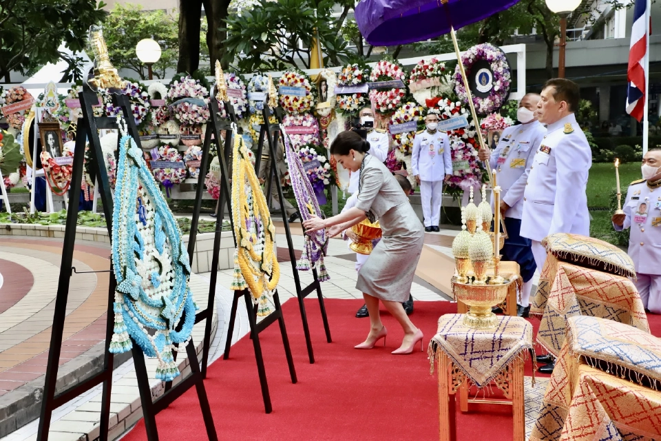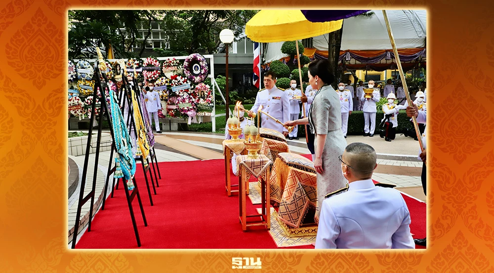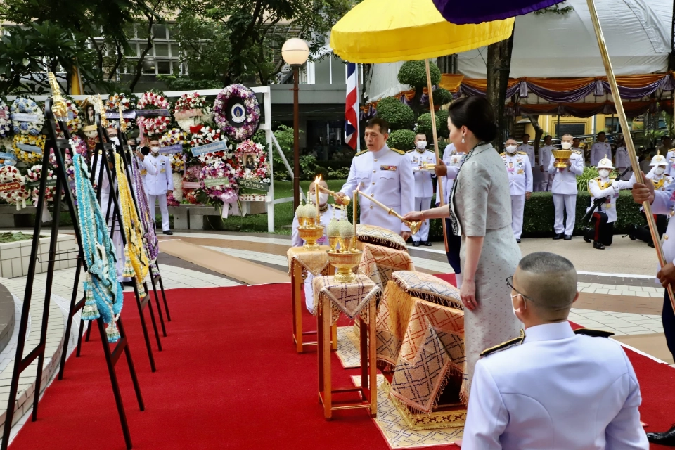 พระบาทสมเด็จพระเจ้าอยู่หัว ทรงวางพุ่มดอกไม้ส่วนพระองค์ ทรงวางพวงมาลัย ทรงจุดธูปเทียนเครื่องทองน้อยถวายราชสักการะ ทรงกราบ สมเด็จพระนางเจ้าฯ พระบรมราชินี ทรงวางพุ่มดอกไม้ของสมเด็จพระนางเจ้าสิริกิติ์ พระบรมราชินีนาถ พระบรมราชชนนีพันปีหลวง และพุ่มดอกไม้ส่วนพระองค์ ทรงวางพวงมาลัย ทรงจุดธูปเทียนเครื่องทองน้อยถวายราชสักการะ ทรงกราบ
