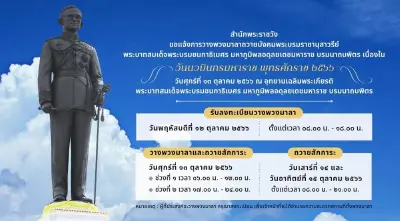 - วันพฤหัสบดีที่ 12 ตุลาคม 2566 รับลงทะเบียนวางพวงมาลา ตั้งแต่เวลา 08.00 น. ถึงเวลา 18.00 น.