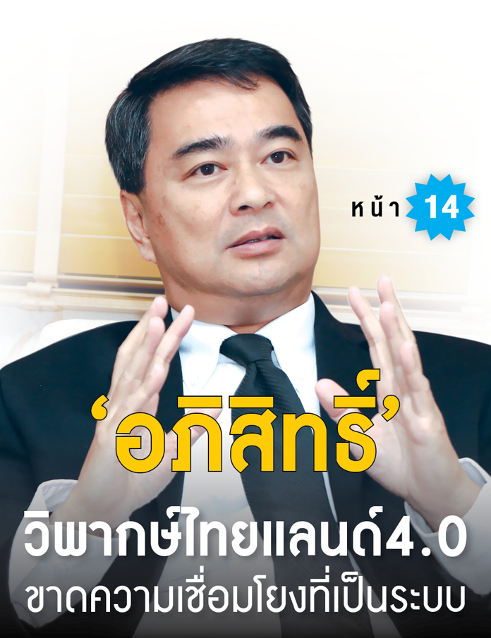 นายอภิสิทธิ์ เวชชาชีวะ อดีตนายกรัฐมนตรี หัวหน้าพรรคประชาธิปัตย์ สะท้อนปัจจัยทำเศรษฐกิจประเทศซึมยาว เกิดจากเงื่อนไขนอกประเทศ ขีดความสามารถการแข่งขันและการเมือง ให้กำลังใจ “ประยุทธ์” ใช้มาตรการกระตุ้นประคับประคองไปก่อน ขณะเดียวกันให้เร่งทำโครงสร้างพื้นฐาน แก้กฎหมายเพิ่มขีดความสามารถทางการเข่งขัน และลดเลื่อมล้ำในสังคม แนะผสมผสานไทยแลนด์ยุค 1.0 - 4.0