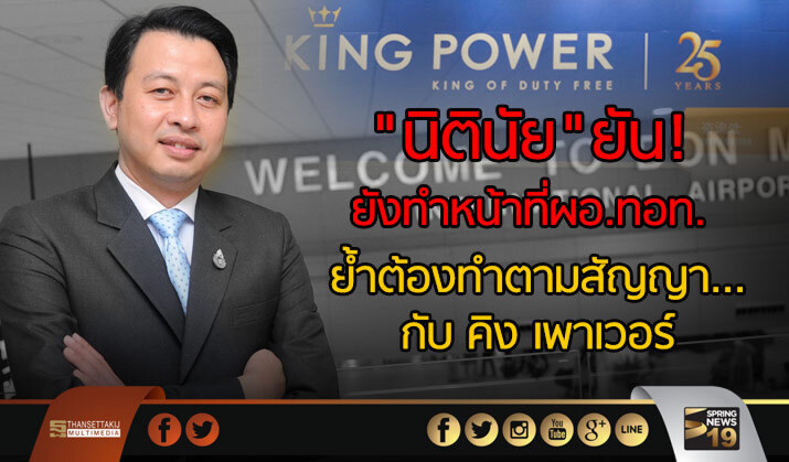 นายนิตินัยกล่าวในรายการเจาะลึกทั่วไทย ทางสปริง เรดิโอ เอฟเอ็ม98.5เมกะเฮริทซ์ในเรื่องนี้ว่า"วันนี้ทำงานตามปกติ เเต่เมื่อวันที่25เม.ย. นายวิษณุ เครืองาม รองนายกรัฐมนตรีเรียก5หน่วยงานเข้ามาเรื่องจุดรับสินค้าขาออกตามที่ผู้ตรวจการเเผ่นดินมีหนังสือเเจ้งทอท.ให้เรียกคืนพื้นที่จุดรับสินค้าขาออกของคิงเพาเวอร์ เเละให้บริษัทอื่นเข้าไปใช้พื้นที่นั้นๆในสนามบินสุวรรณภูมิ โดยให้ทอท.ทำหนังสือตอบใน60วัน วันนั้นนายวิษณุสอบถามข้อมูลในเรื่องนี้เพื่อให้ข้อเท็จจริงยุติก่อนส่งหนังสือไปให้ผู้ตรวจการเเผ่นดิน ในวันนั้นไม่มีข้อสรุป โดยนายวิษณุบอกให้ทุกฝ่ายปฏิบัติตามกฎหมาย โดยเรื่องใดฝ่ายใดรับผิดชอบก็ต้องปฏิบัติตามกติกา จุดรับสินค้าขาออกที่ทอท.มีนิติกรรมสัญญากับคิงเพาเวอร์นั้นจะหมดสัญญาปี2563 จึงต้องรอสัญญาหมดก่อน หากกลุ่มบริษัทล็อตเต้ของเกาหลีใต้เเละผู้ร่วมทุนของไทยอยากประกอบการในจุดรับสินค้าขาออกก่อนปี2563 ต้องติดต่อคิงเพาเวอร์ในฐานะคู่สัญญากับทอท.หรือต้องรอสัญญาของคิงเพาเวอร์หมดอายุ